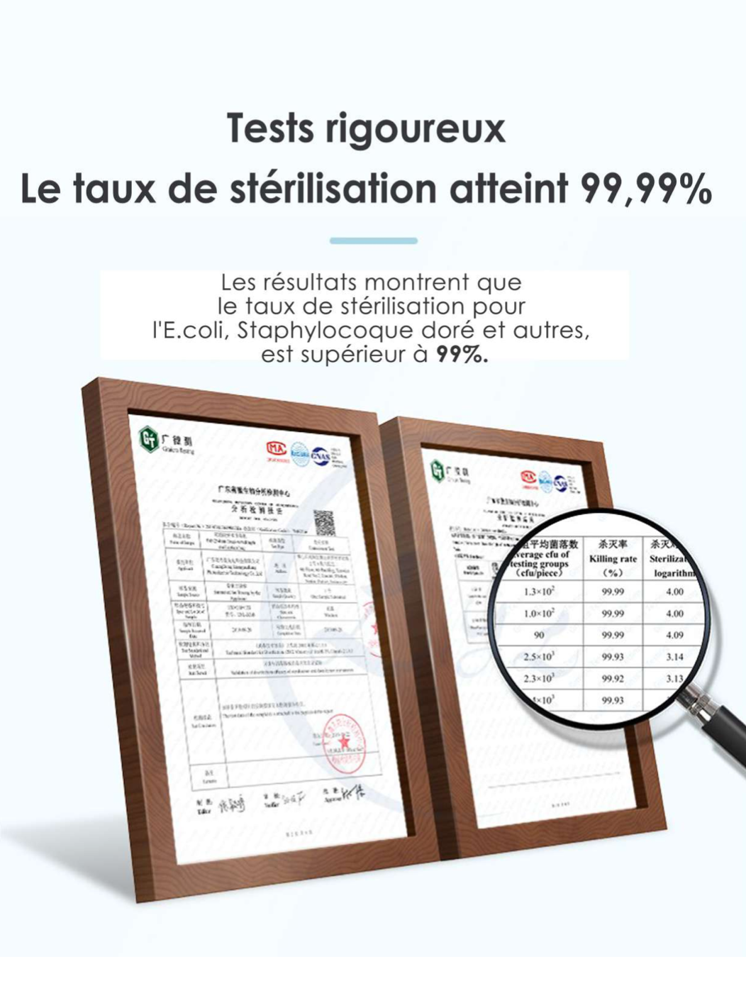 Pratique et transportable facilement, désinfectez n’importe où vos accessoires et protégez-vous ainsi des bactéries et virus, pour un taux d’efficacité de plus de 99% en seulement 5 minutes.